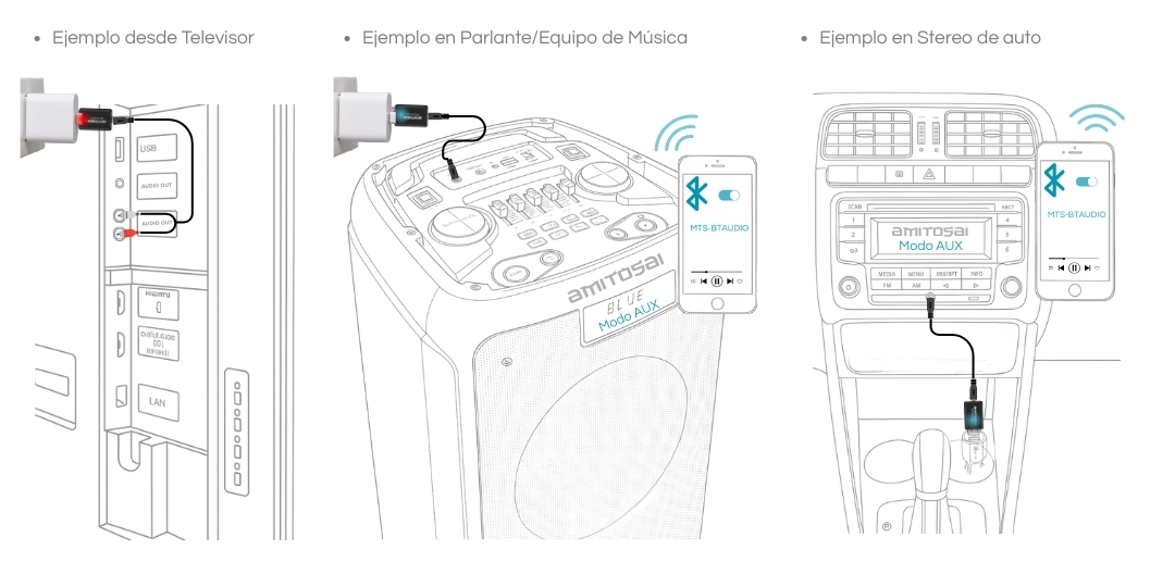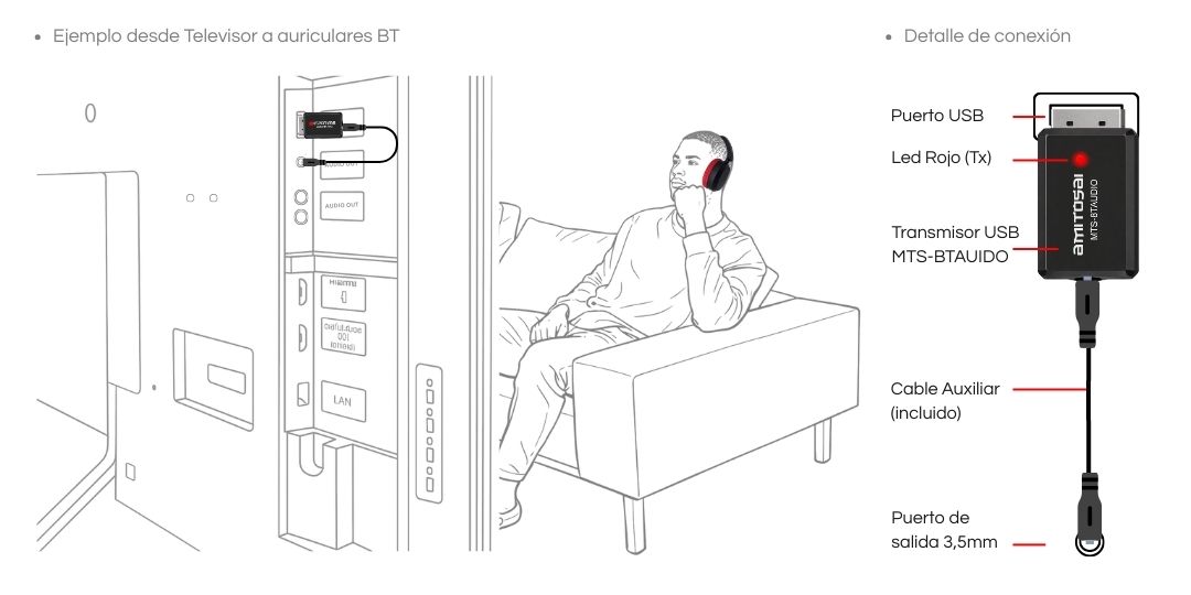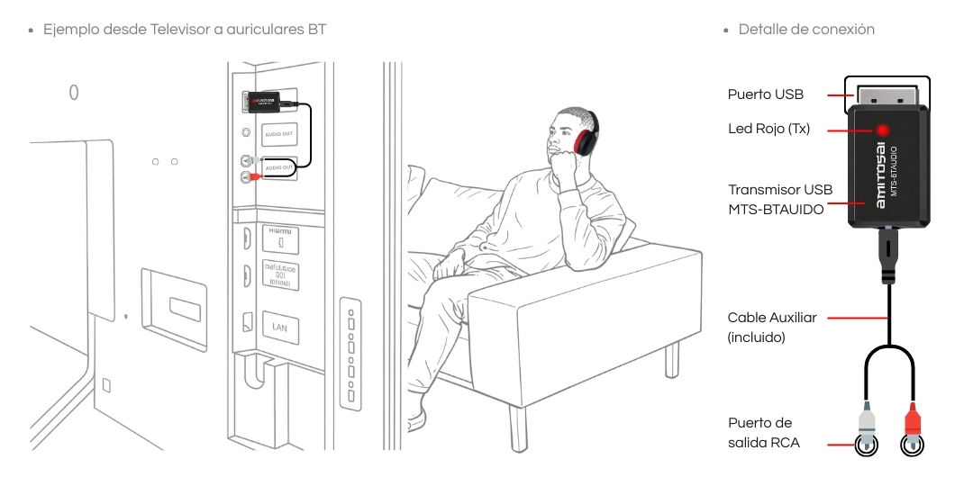 RX: Recibe audio desde celulares, tablets o notebooks hacia equipos sin Bluetooth.