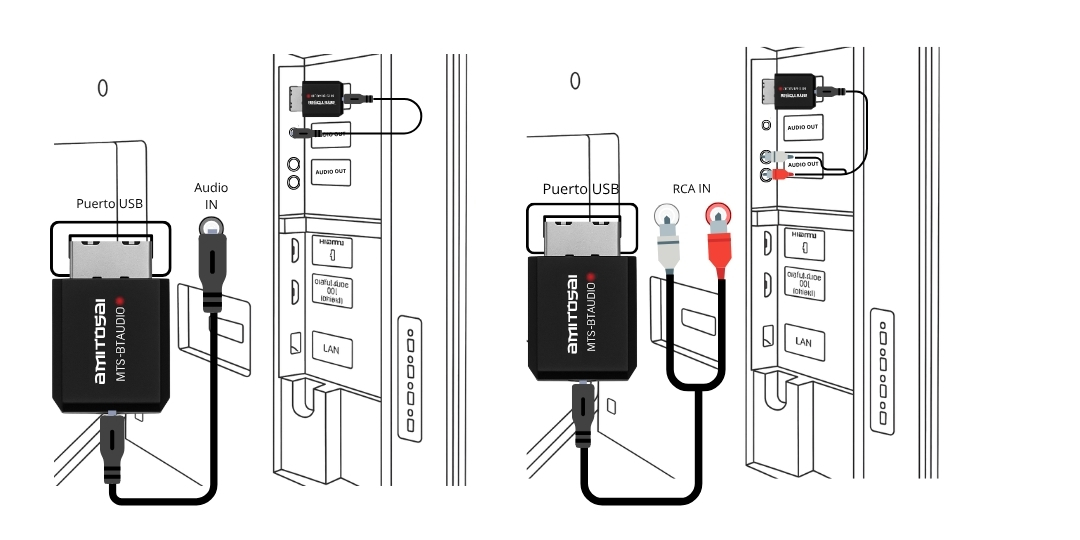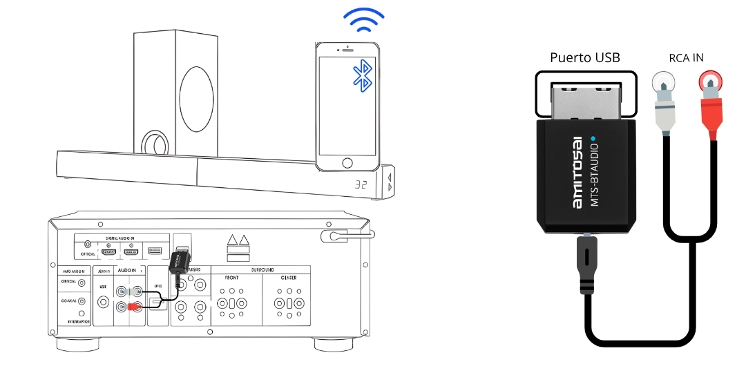 *** No todos los puertos USB cuentan con la capacidad de leer y alimentar correctamente el adaptador. Por este motivo, aunque el equipo esté diseñado para funcionar únicamente por USB, no siempre es posible garantizar un funcionamiento pleno en todos los dispositivos. Para asegurar la compatibilidad, el adaptador incluye cables Mini Plug y RCA. Basta con mantener el USB conectado para la alimentación y utilizar el cable auxiliar o RCA para la transmisión de audio hacia la entrada correspondiente de tu equipo. De esta forma, se evitan posibles inconvenientes de compatibilidad o reproducción. ***