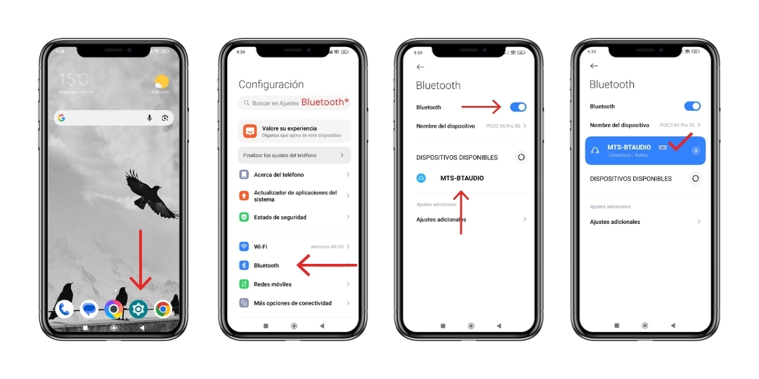 Verifica que tu dispositivo transmisor tenga activado el Bluetooth. Asegúrate de que no esté conectado previamente a otro dispositivo. Reinicia el receptor y vuelve a emparejar. El emparejamiento con tu dispositivo es muy sencillo, dirígete a la configuración/ajustes y allí busca el apartado Bluetooth, verifica que este activado y en "Dispositivos disponibles" o similar, busca el "MTS-BTAUDIO", pulsa en el para realizar la vinculación y listo! Ya podrás transmitir música desde tu dispositivo.