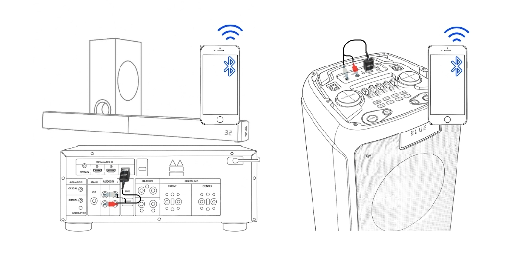 ***No todos los puertos USB cuentan con la capacidad de leer y alimentar correctamente el adaptador. Por este motivo, aunque el equipo esté diseñado para funcionar únicamente por USB, no siempre es posible garantizar un funcionamiento pleno en todos los dispositivos. Para asegurar la compatibilidad, el adaptador incluye cables Mini Plug y RCA. Basta con mantener el USB conectado para la alimentación y utilizar el cable auxiliar o RCA para la transmisión de audio hacia la entrada correspondiente de tu equipo. (Opción 2 y 3) De esta forma, se evitan posibles inconvenientes de compatibilidad o reproducción.***