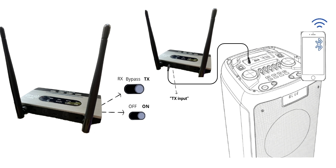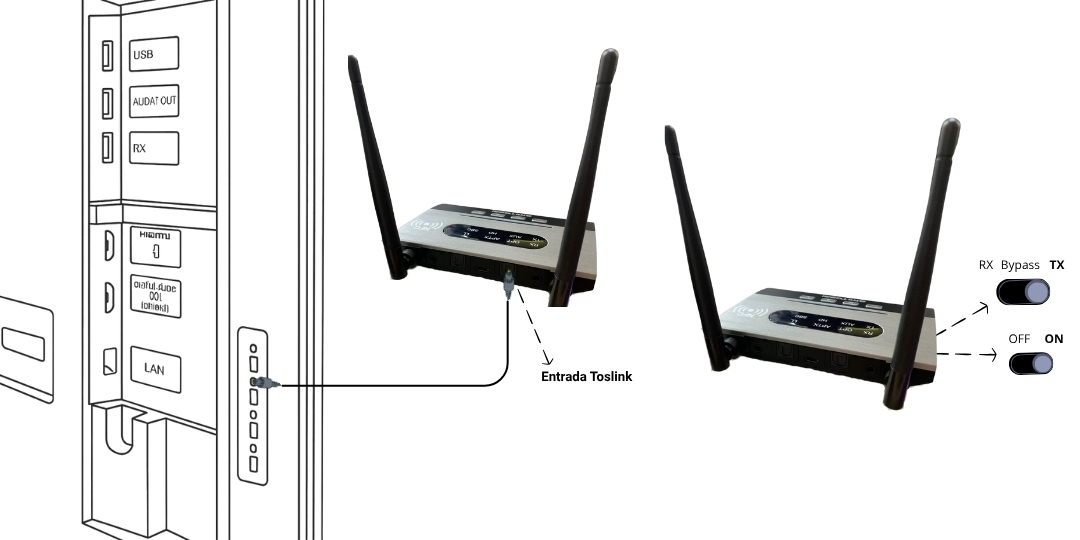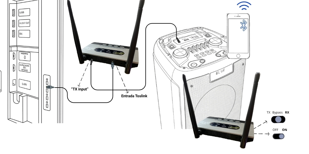 En cambio, con este sistema podés dejar el equipo fijo entre tu TV y tu home Theatre: en modo BYPASS el audio pasa normalmente al home Theatre, y cuando querés usar Bluetooth solo movés el selector a modo TRANSMISOR. No hace falta tocar ningún cable. Es práctico y muy conveniente.