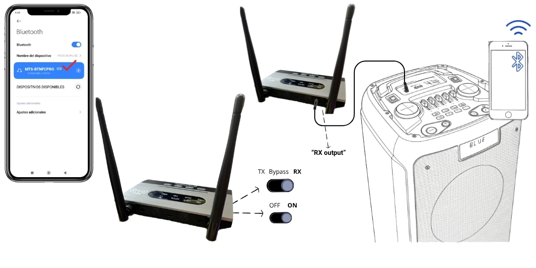 - Conecta el equipo de audio al MTS-BTNFCPRO mediante un cable de audio (analógico "RX output" o Toslink).