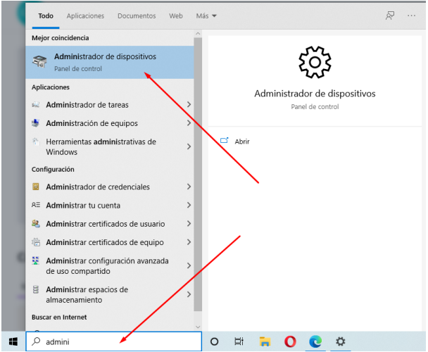 Ve al menú inicio de tu computadora y escribe “administrador de dispositivos”, luego ingresa a esa opción: