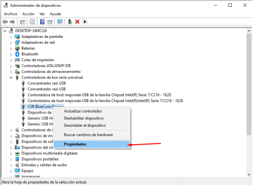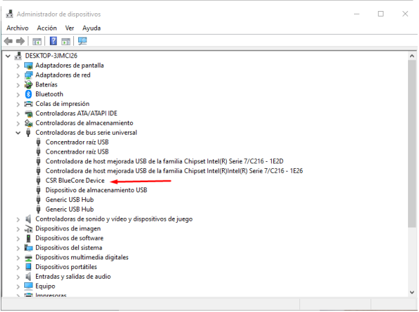 1. Busca el menú “Controladores de bus serie universal” y presiona sobre él para extenderlo. Luego busca un dispositivo llamado CSR BlueCore Device (esto es lo que Windows instaló mal y vamos a reparar):