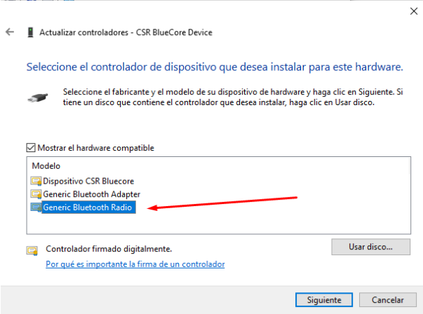 6. En el paso siguiente, vamos a elegir el dispositivo “Generic Bluetooth Radio” Luego le damos click a “Siguiente”.