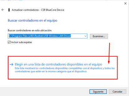5. En el siguiente paso, elegimos la opción “Elegir en una lista de controladores disponibles en el equipo” (aquí vamos a indicarle a Windows que use el driver que instalamos y no el viejo que está usando ahora).