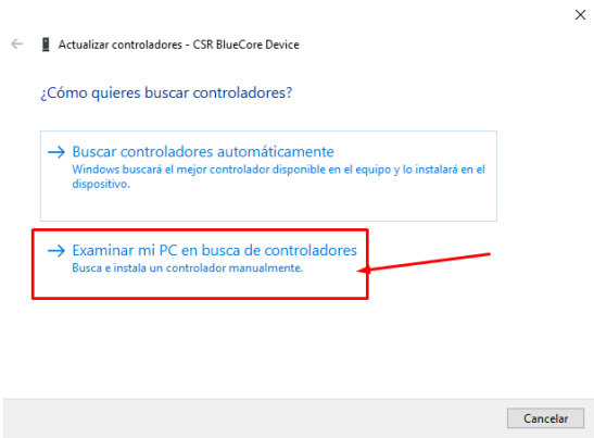 4. En el siguiente paso, seleccionamos la opción “Examinar mi PC en busca de controladores”.