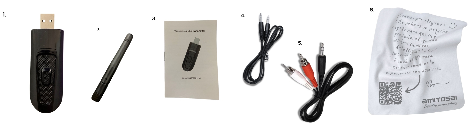 1. Transmisor de audio inalámbrico 2. Antena 3. Manual de instrucciones 4. Cable de audio 3.5 mm 5. Cable RCA 6. Paño de cortesíaCaracterísticas técnicas